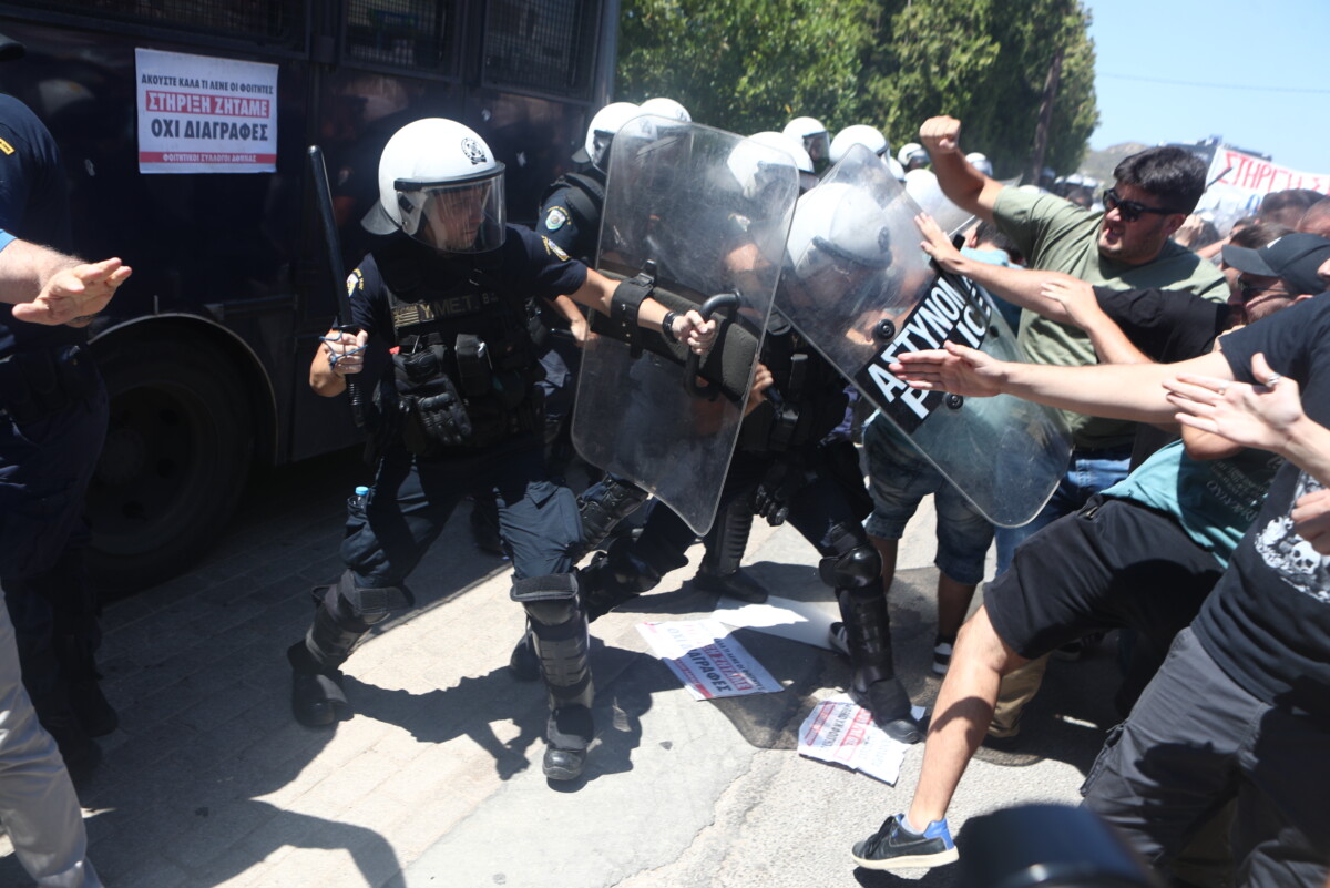 Σύμφωνα με πληροφορίες, φοιτητές που διαμαρτύρονται για το νέο νομοσχέδιο σχετικά με τις διαγραφές και το πειθαρχικό πλαίσιο για τη βία στα πανεπιστήμια, προσπάθησαν να κολλήσουν κάποιες αφίσες στις κλούβες των ΜΑΤ που βρίσκονταν μπροστά από το ξενοδοχείο.
