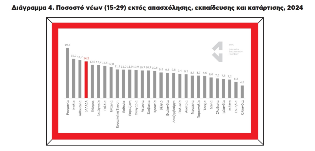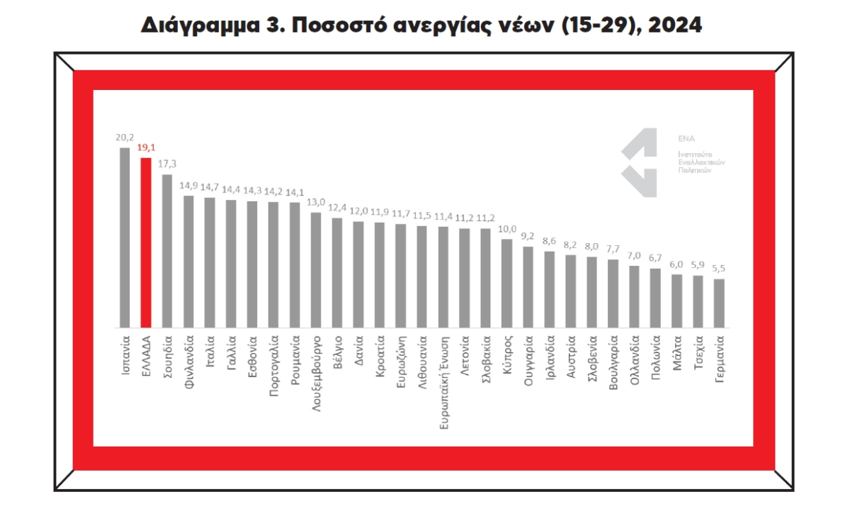 Και η ανεργία των νέων (ηλικίας 15-29) ακολουθεί την ίδια πορεία. Από το 29,8% του 2019 έπεσε στο 19,1% το 2024, όμως βρίσκεται στη δεύτερη υψηλότερη θέση μεταξύ των χωρών της Ευρωπαϊκής Ένωσης και αισθητά πάνω από τους μέσους όρους της Ευρωζώνης (11,7%) και της Ευρωπαϊκής Ένωσης (11,4%).