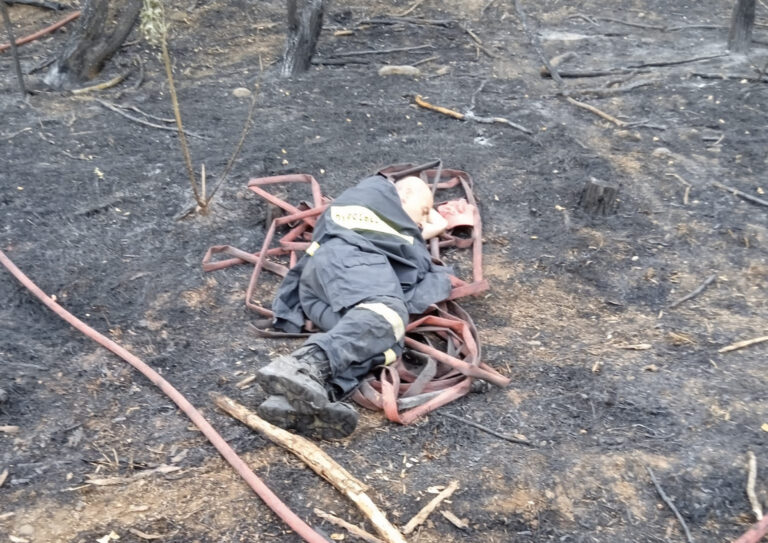 Συγκίνηση προκαλεί η φωτογραφία ενός πυροσβέστη, ο οποίος είναι ξαπλωμένος σε καμένη γη, έχοντας ως στρώμα μια μάνικα, έπειτα από μάχη με τη φωτιά στην Ιτέα, στον Έβρο.