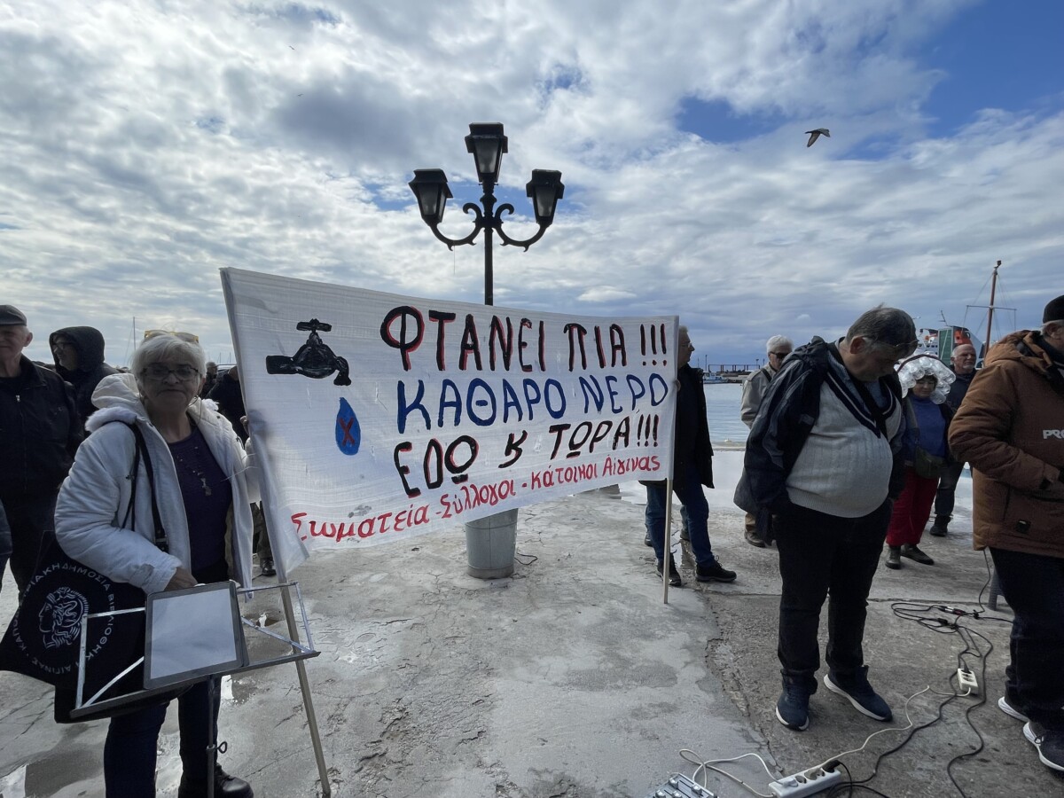 «Από τον Δεκέμβριο, ο κόσμος άρχισε να έχει προβλήματα υγείας, να παθαίνουν βλεφαρίτιδες τα μάτια τους. Δεν ξέραμε από τι είναι γιατί πιστεύαμε ότι είχαμε το νερό που είχαμε πάντα» είπε ομιλήτρια της συγκέντρωσης διαμαρτυρίας σήμερα το πρωί στο λιμάνι της Αίγινας δίνοντας έμφαση στο ότι ο δήμος δεν ενημέρωσε τους πολίτες ώστε να προφυλαχτούν.