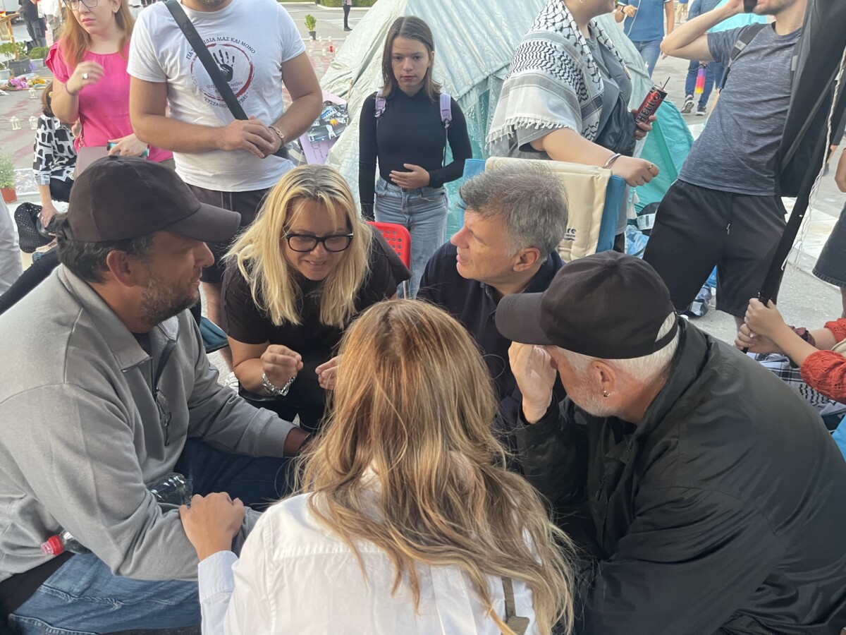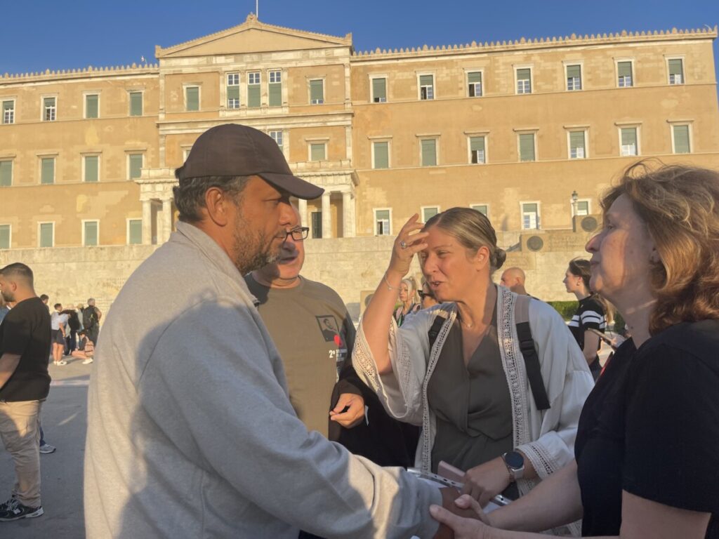 Στο Σύνταγμα ο κόσμος σταματάει και του μιλάει. Εκείνος τους υποδέχεται όρθιος. Πολίτες όλων των ηλικιών, εκπροσώπους από εκπαιδευτικούς και πολιτιστικούς συλλόγους και ομοσπονδίες Οι οικείοι του του λένε να κάτσει να ξεκουραστεί. Πολίτες τον αγκαλιάζουν και δηλώνουν τη συμπαράσταση τους. Γράφουν τις ευχές τους στα δύο τετράδια.