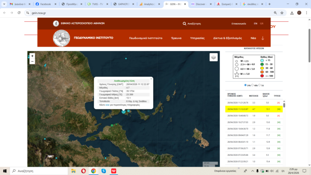 Σεισμός μεγέθους 4,7 Ρίχτερ σημειώθηκε το μεσημέρι της Τρίτης 28 Απριλίου δυτικά της Σκιάθου.