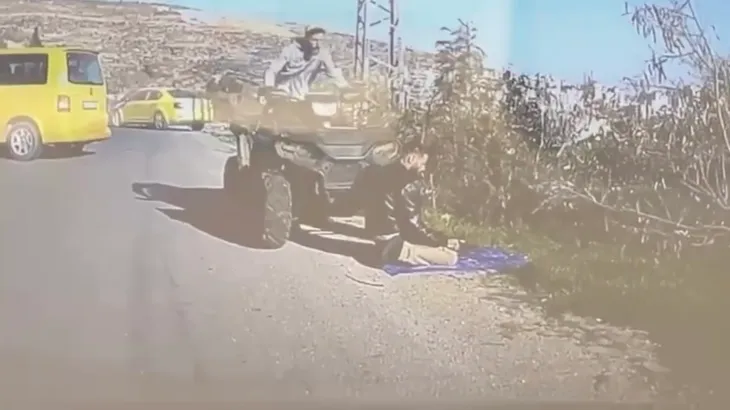 Όπως φαίνεται στα πλάνα που έφερε στη δημοσιότητα το Al Jazeera, ένας άνδρας που φέρεται να είναι έποικος οδηγεί μια γουρούνα και παρασέρνει έναν Παλαιστίνιο που απλά προσευχόταν.