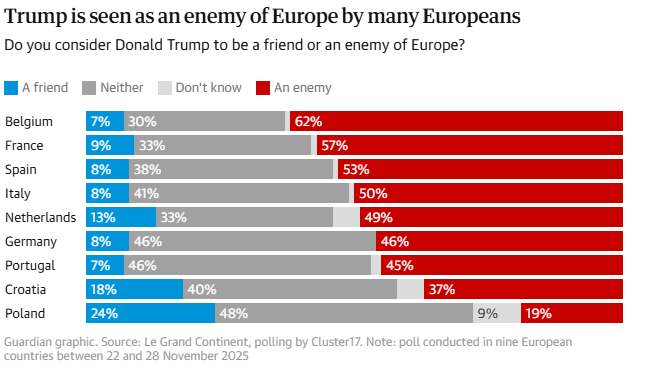«Σε όλη την ήπειρο, ο τραμπισμός αντιμετωπίζεται ξεκάθαρα ως μια εχθρική δύναμη», εξήγησε ο Dormagen, σημειώνοντας ότι αυτή η αντίληψη ενισχύεται με τον χρόνο, με ολοένα λιγότερους να απαντούν ότι ο Τραμπ είναι «ούτε φίλος ούτε εχθρός» και ολοένα περισσότερους να τον θεωρούν σαφώς επικίνδυνο.