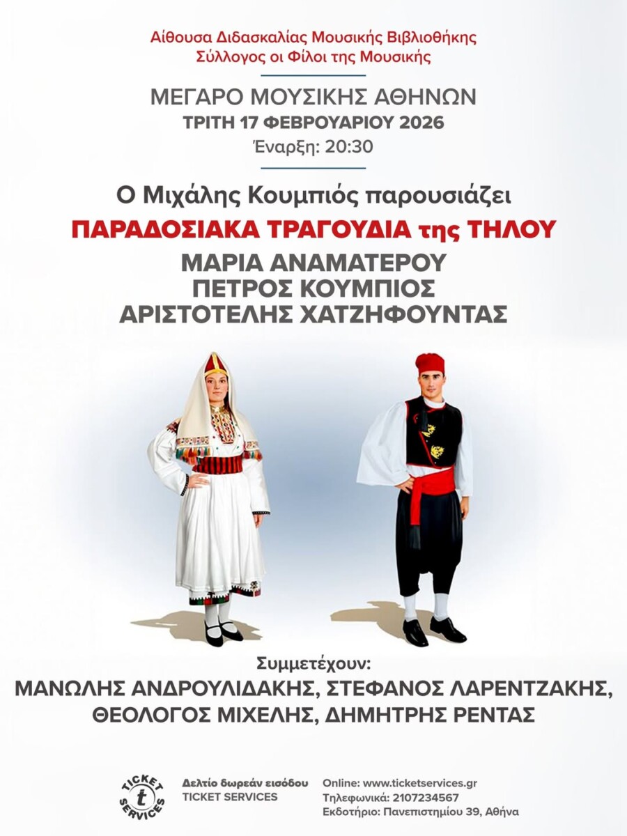 «Αν δεν είχα μεγαλώσει στην Τήλο, η μουσική μου θα ήταν τελείως διαφορετική» λέει στο tvxs ο συνθέτης Μιχάλης Κουμπιός με αφορμή τη συναυλία του στις 17 Φεβρουαρίου στο Μέγαρο Μουσικής με τα παραδοσιακά τραγούδια της ιδιαίτερης πατρίδας του. Μαζί του οι: Μαρία Αναματερού, Πέτρος Κουμπιός, Αριστοτέλης Χατζηφούντας. Συμμετέχουν επίσης οι Μ. Ανδρουλιδάκης, Σ. Λαρεντζάκης, Θ. Μιχάλης, Δ. Ρέντας.
